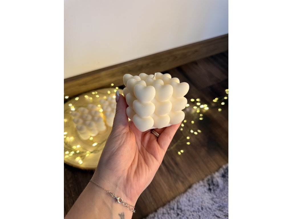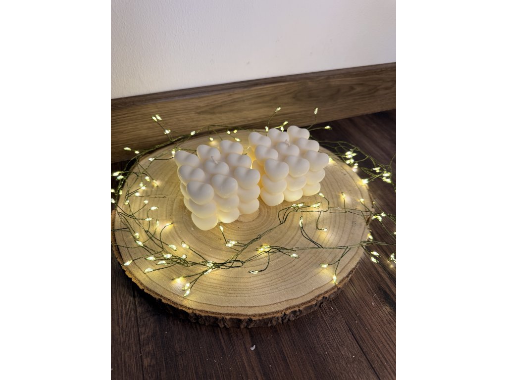 Dekorativní svíčka tvořená drobnými srdíčky zaujme svým roztomilým a originálním designem. Každé srdíčko vytváří jemnou texturu a dodává svíčce romantický a hravý vzhled. Díky dlouhé době hoření je nejen krásnou dekorací, ale i zdrojem příjemné a útulné atmosféry. Ideální jako doplněk domova nebo jako stylový a originální dárek pro někoho, koho chcete potěšit.