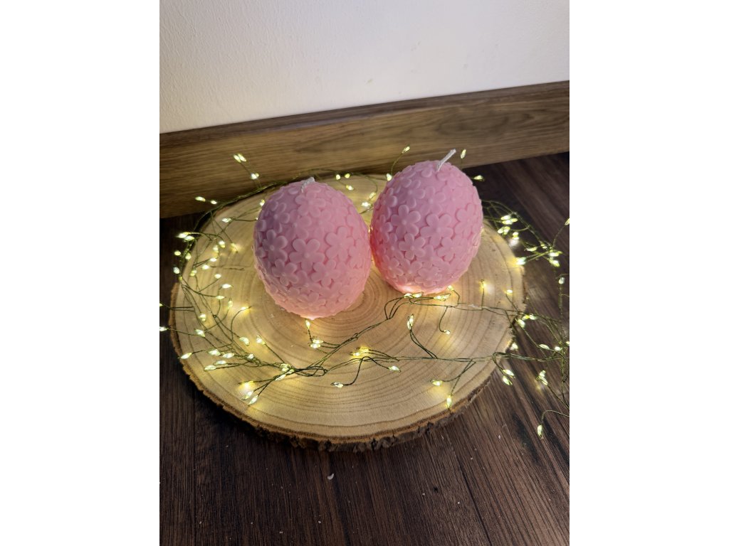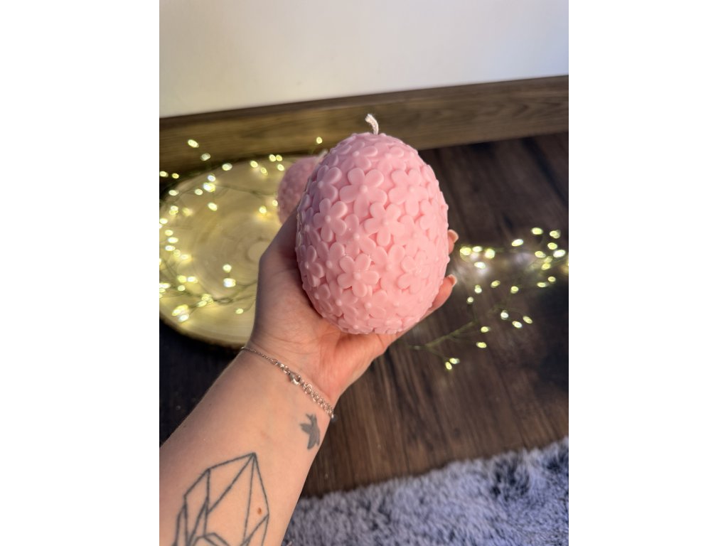Svíčka ve tvaru vejce, jemně pokrytá květinovými detaily, okouzlí něžným a romantickým vzhledem. Každý detail květin na jejím povrchu dodává svíčce eleganci a dekorativní charakter, díky čemuž se stává nádherným doplňkem interiéru. S dlouhou dobou hoření vytváří příjemnou a klidnou atmosféru, ideální pro dekoraci domova nebo jako originální a stylový dárek.