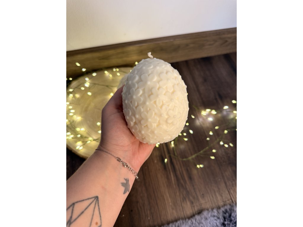 Svíčka ve tvaru vejce, jemně pokrytá květinovými detaily, okouzlí něžným a romantickým vzhledem. Každý detail květin na jejím povrchu dodává svíčce eleganci a dekorativní charakter, díky čemuž se stává nádherným doplňkem interiéru. S dlouhou dobou hoření vytváří příjemnou a klidnou atmosféru, ideální pro dekoraci domova nebo jako originální a stylový dárek.
